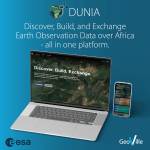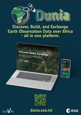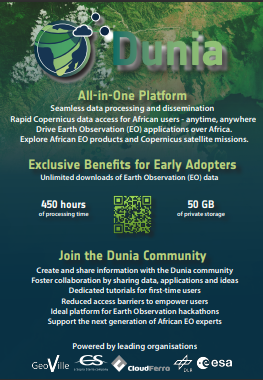 Users can choose from a wide range of African Earth Observation (EO) products and Copernicus satellite missions, and search, filter and view the data of their choice. Thanks to innovative solutions, they can obtain the datasets they want to analyse locally without worrying about bandwidth or endless download times. Thoughtfully selected datasets empower users to conduct a wide array of analyses, encompassing administrative boundaries, digital elevation models, and the complete Copernicus Sentinels catalog. Users have the capability to create and disseminate information about their solutions, fostering a sense of community through the sharing of data and applications with others. Dunia provides cloud development environments, equipped with popular and powerful data processing tools like JuypterLab and QGIS. Early adopters enjoy benefits like 450 hours of included processing, 50 GB of private storage, and unlimited downloads of Earth Observation (EO) data. Additionally, there’s a dedicated live online training program with comprehensive tutorials tailored for first-time users, aimed at reducing access barriers. The Dunia service can be accessed at:https://dunia.esa.int/
