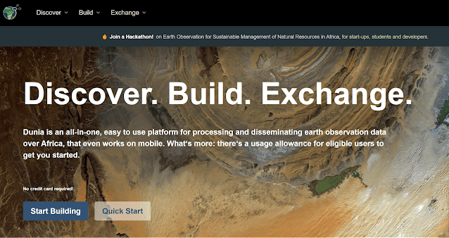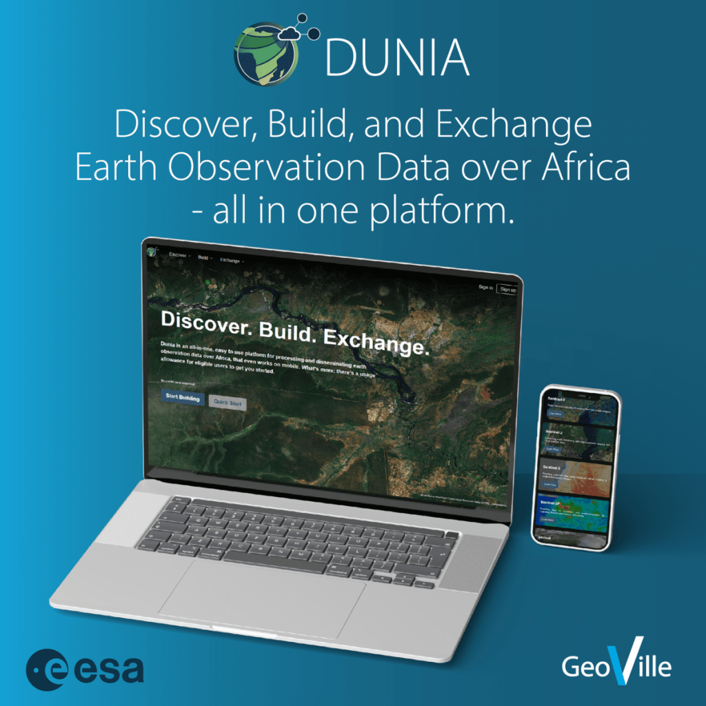 Dunia is an all-in-one, easy-to-use platform for processing and disseminating Earth Observation data over Africa, that even works on mobile and low bandwidth. Freely discover, build, exchange